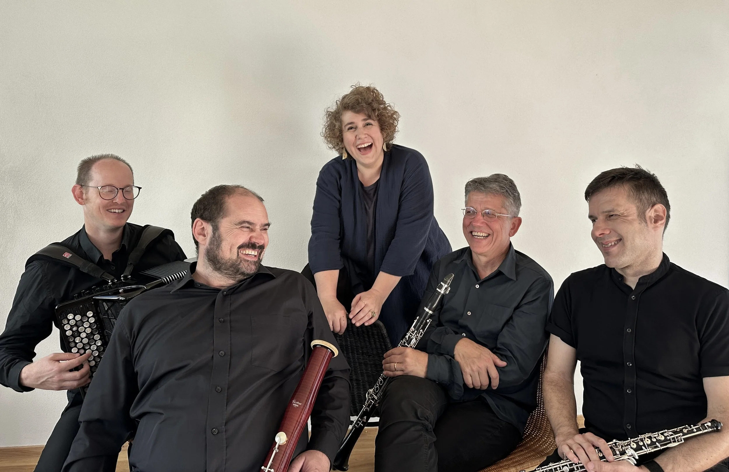 Das Trio «en vogue», Roberto Cuervo, Oboe, Franco Mettler, Klarinette und Gion-Andrea Casanova, Fagott bieten zusammen mit dem Akkordeonisten Thomas Weber und der wunderbaren Sängerin Astrid Alexander «gourmandises francaises»!